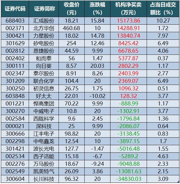 盘后龙虎榜数据显示,今日机构席位资金合计净卖出约7791.19万元。其中,净买入的个股11只,净卖出的个股11只。机构净买入最多的股票是汇成股份,净买入金额约1.52亿元;机构净买入居前的还有北方华创、力星股份(300421)、矽电股份等股。机构净卖出最多的股票是长川科技,净卖出金额约3.48亿元;机构净卖出居前的还有凯美特气(002549)、万马股份(002276)、西子洁能等股。