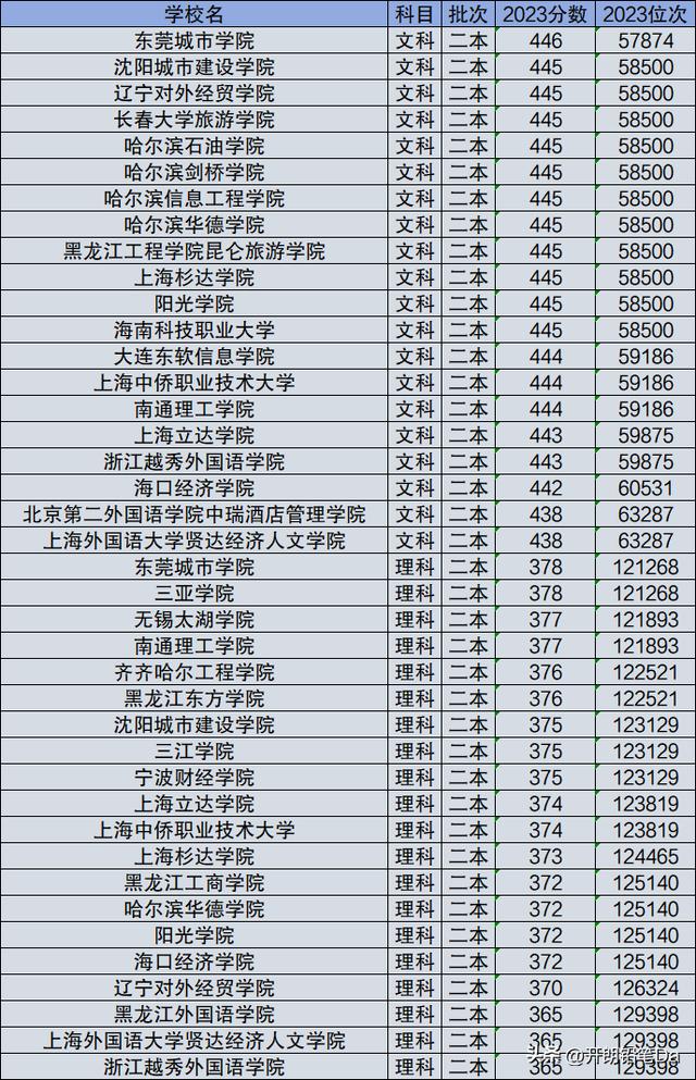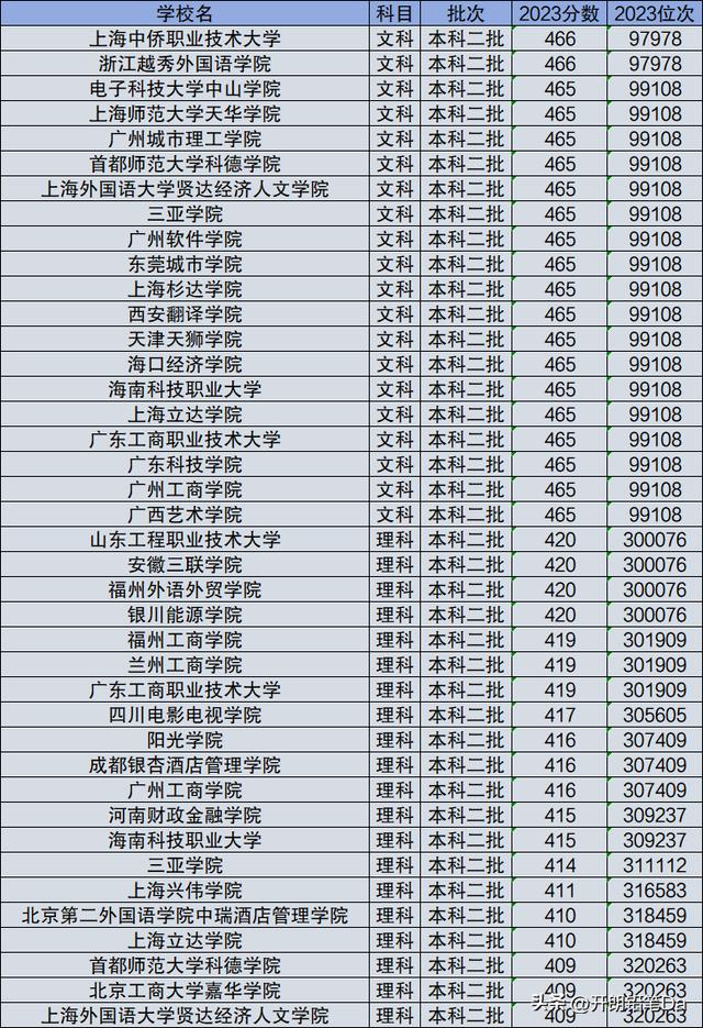 2023年,文科二批465分,收分较低的大学在批线招生。可见,即使文科生成绩在批线左右,也有很大的机会被本科院校录取。但这类本科学校大多在省外,所以学生在填报时要做好准备。文科成绩较低的大学包括三亚学院、东莞城市学院、广东科技学院、上海杉达学院等等,最低分465分。