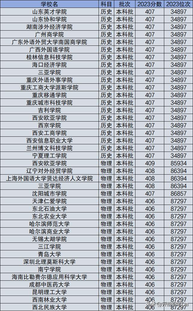 历史批次线2023年407分,最低收入大学包括最低收入大学湖南涉外经济学院、山东人才学院、山东协和学院、西安工商学院、西京学院、宁夏理工学院、重庆移通学院等,这些学校的最低分与批次线一致,是考生最容易考的大学。