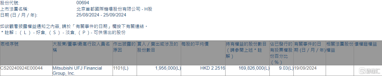 格隆汇9月25日丨根据联交所最新权益披露资料显示,2024年9月19日,北京首都机场股份(00694.HK)获Mitsubishi UFJ Financial Group, Inc.在场内以每股均价2.2516港元增持195.6万股,涉资约440.41万港元。