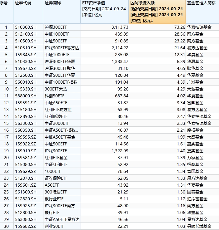 最受青睐ETF:9月24日华泰柏瑞沪深300ETF获净申购73.26亿元,南方中证1000ETF获净申购28.56亿元(名单)