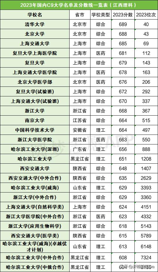 从上图的排名可以看出,C9联盟中排名最低的大学也在中国排名第14位,其中8所在中国排名前十。这也反映了C9大学的整体实力。二、国内C9大学录取分数线清单