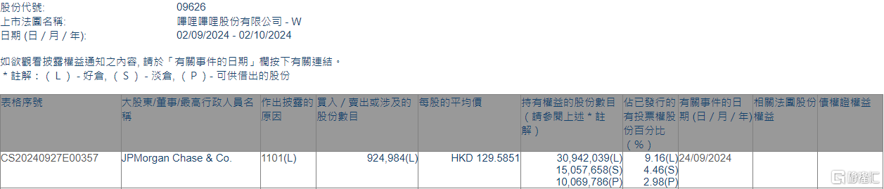格隆汇10月2日丨根据联交所最新权益披露资料显示,2024年9月24日,哔哩哔哩-W(09626.HK)获JPMorgan Chase & Co.以每股均价129.5851港元增持好仓92.5万股,涉资约1.20亿港元。