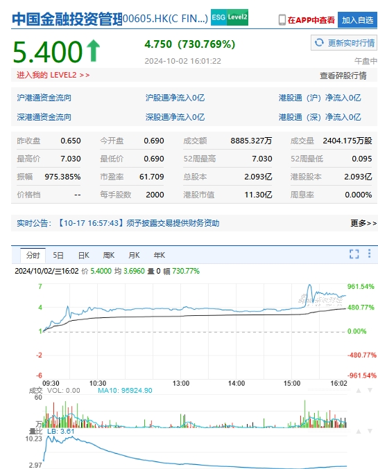 港股中国金融投资管理(00605.HK)尾盘一度涨超10倍,截至发稿涨761%,成交超8000万港元。