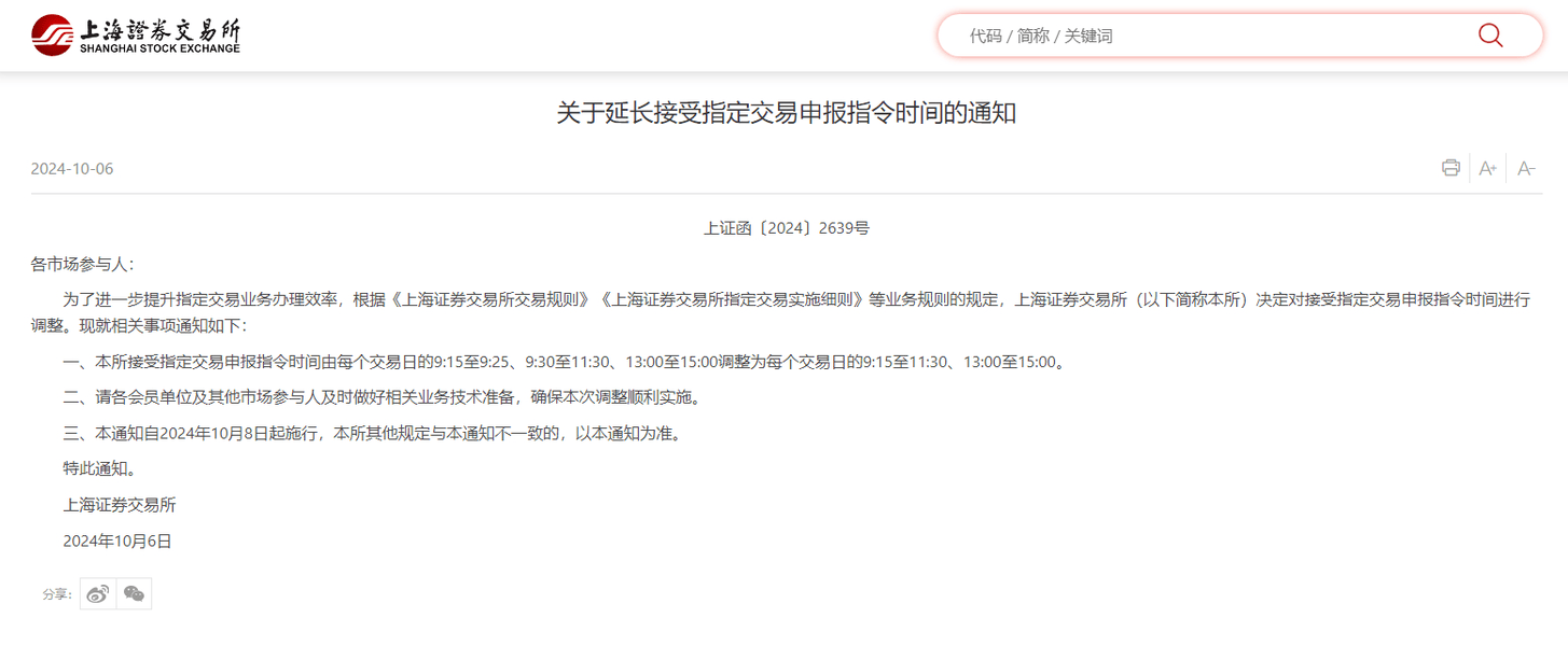 上交所发布延长接受指定交易申报指令时间的通知,为了进一步提升指定交易业务办理效率,接受指定交易申报指令时间由每个交易日的9:15至9:25、9:30至11:30、13:00至15:00调整为每个交易日的9:15至11:30、13:00至15:00。通知自2024年10月8日起施行。