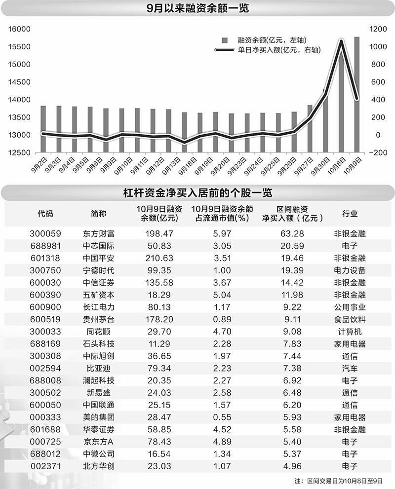 10月9日,东方财富、中信证券盘中股价创历史新高。其中,融资资金单日净买入东方财富和中信证券,分别为49.24亿元和15.52亿元。