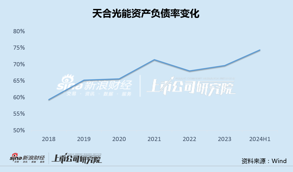 不过,连续融资并未根本缓解公司的资金压力。2018年至2023年,天合光能资产负债率从59.3%逐年上升至69.6%,今年上半年再度攀升至74.3%,达到新高。