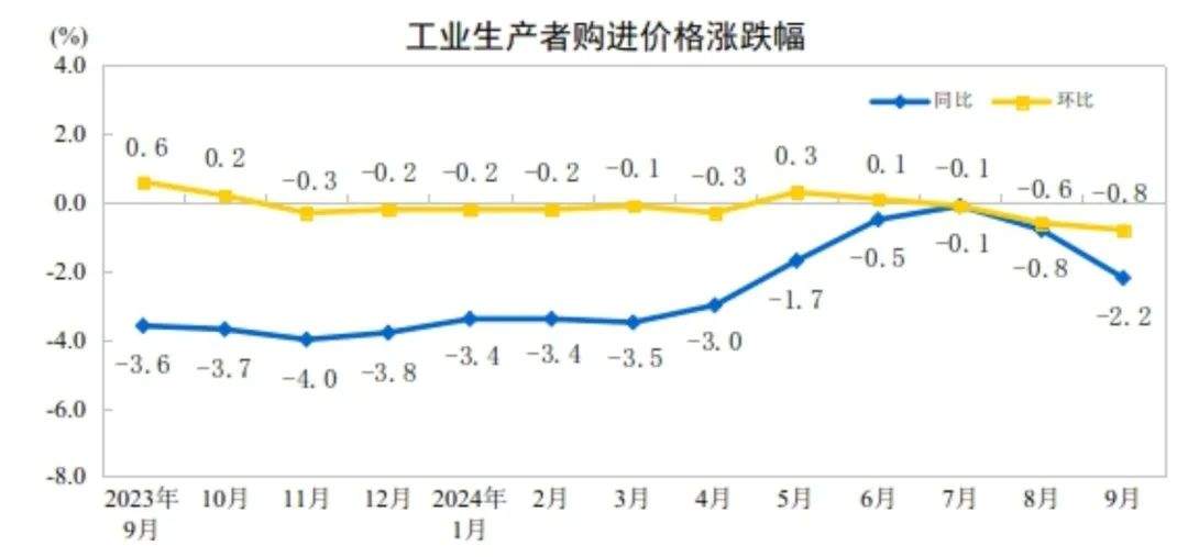 2024年9月份,全国工业生产者出厂价格同比下降2.8%,环比下降0.6%;工业生产者购进价格同比下降2.2%,环比下降0.8%。1―9月平均,工业生产者出厂价格比上年同期下降2.0%,工业生产者购进价格下降2.1%。