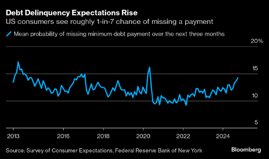 根据纽约联邦储备银行的一项调查,预计自己可能拖欠债务的美国消费者比例上个月上升至2020年4月以来的最高水平。