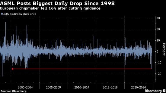 斯托克欧洲600指数在伦敦市场收盘下跌0.8%,但距离9月27日创下的纪录高点仍仅一步之遥。早前发布财报的阿斯麦重挫16%,拖累科技股走低。科技板块下跌6.5%,创约四年来的最大跌幅。