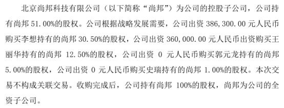 挖贝网10月17日,英诺威尔(835013)近日发布公告,北京尚邦科技有限公司(以下简称“尚邦”)为公司的控股子公司,公司持有尚邦51.00%的股权。公司根据战略发展需要,公司出资386,300.00元人民币购买李想持有的尚邦30.50%的股权,公司出资360,000.00元人民币出资购买王丽华持有的尚邦12.50%的股权,公司出资0元人民币购买郭元龙持有的尚邦5.00%的股权,公司出资0元人民币购买史瑞持有的尚邦1.00%的股权。本次交易不构成关联交易。收购完成后,公司持有尚邦100%的股权,尚邦为公司的全资子公司。