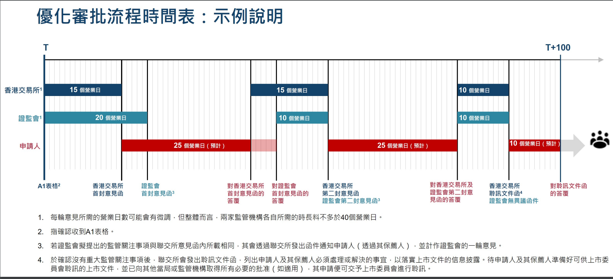 香港证监会称,优化新上市申请审批流程时间表,以进一步提升香港作为区内领先的国际新股集资市场的吸引力。申请人及其保荐人预期可于总共约60个营业日内就监管机构提出的意见给予完满答覆。待取得上市委员会及其他相关部门或监管机构批准后,申请程序预计可於六个月的申请有效期内完成。在合资格A股公司快速审批时间表下,若合资格A股上市公司提交完全符合规定的申请,证监会及联交所分别只会发出一轮监管意见。在此情况下,两家监管机构各自的监管评估将在不多于30个营业日内完成(而非上述适用于‘完全符合规定的申请’的不多於40个营业日)。