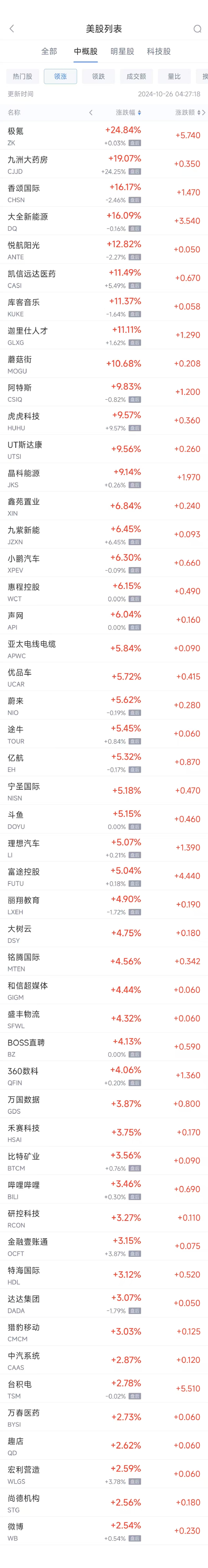 领涨中概股列表: