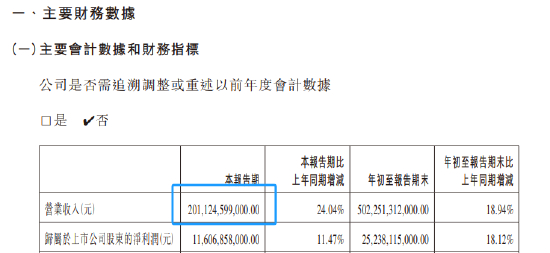 比亚迪股份今日公告,2024年第三季度公司实现营业收入2011.25亿元,同比增长24.04%;归属于上市公司股东的净利润为116.07亿元,同比增长11.47%;前三季营收5022.5亿元,上年同期为4222.75亿元。