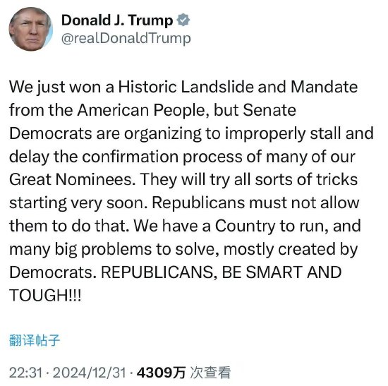 近日,美国当选总统唐纳德·特朗普发表言论称,尽管赢得所谓“历史性压倒性胜利和授权”,但参议院民主党人正组织起来,企图不正当的拖延和阻碍其众多提名者的确认进程。他警告称,民主党人将很快使出各种手段,共和党人必须加以阻止,强调“我们有国家要治理,有许多重大问题亟待解决,而这些问题大多是民主党造成的”,并呼吁共和党人要“聪明且强硬”。