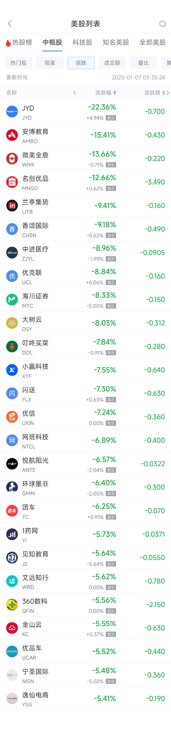 下跌股当中(按市值降序排列),阿里巴巴跌0.02%,网易跌0.03%,京东跌0.57%,携程跌3.34%,百度跌0.66%,理想汽车跌3.43%,贝壳跌1.61%,腾讯音乐跌2.24%,中通跌1.92%,满帮跌1.58%,华住酒店集团跌3.58%,WSP控股跌0.10%,名创优品跌12.66%,哔哩哔哩跌0.76%,极氪跌2.64%,BOSS直聘跌2.51%,360数科跌5.56%。