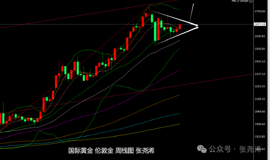 周线级别:金价连续数周持续处于等边三角形震荡调整趋势发展,且附图指标目前空头信号有所减弱,走势也处于中轨及5-10周均线上方,不断上移的低点也未持稳跌破中轨线支撑,这对于后市来讲,其形态和走势上,有向上打破调整,再度走强的预期前景。