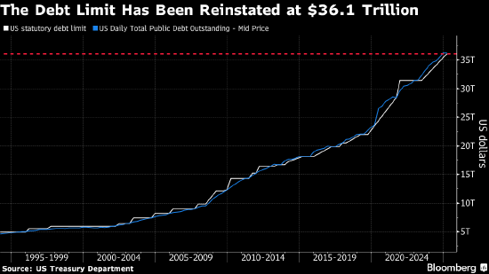 根据美国财政部周三披露的每日公告,截至1月14日,受制于上限的公共债务总额为36.087万亿美元。这仅比36.1万亿美元的上限低166亿美元。