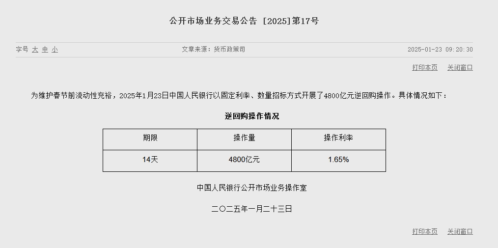 1月23日金融一线消息,央行今日进行4800亿元14天期逆回购操作,中标利率为1.65%,与此前持平。今日有3405亿元逆回购到期。