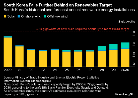 (注: 根据《第11次电力供需基本计划》草案,韩国的目标是到2030年光伏和风电装机容量目标达到72GW。截至2024年12月,韩国光伏和风电累计装机容量估计为31.3GW。)