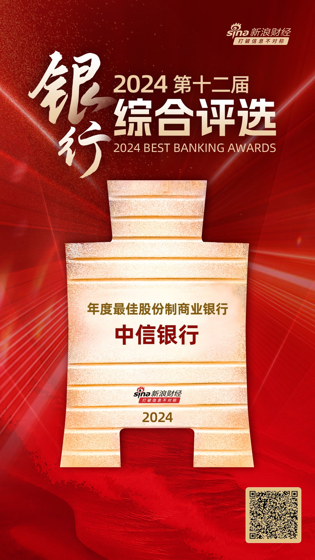 1月23日金融一线消息,由新浪财经主办的“2024(第十二届)银行综合评选”活动获奖名单今日正式揭晓!中信银行获评“年度最佳股份制商业银行”。