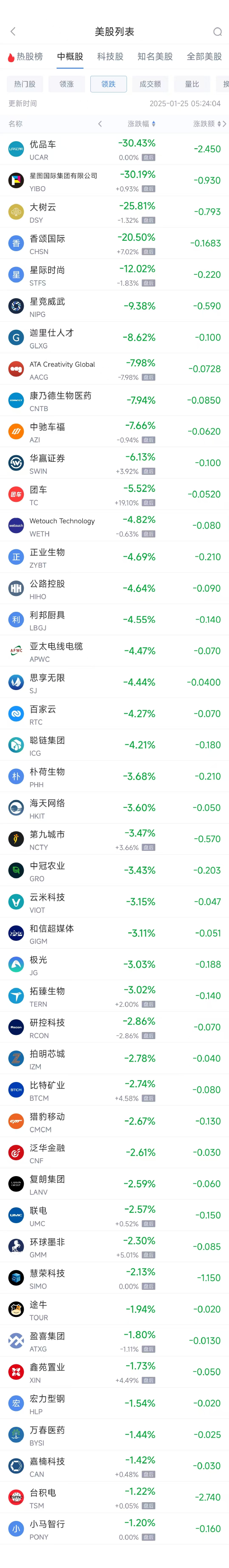 领跌中概股列表: