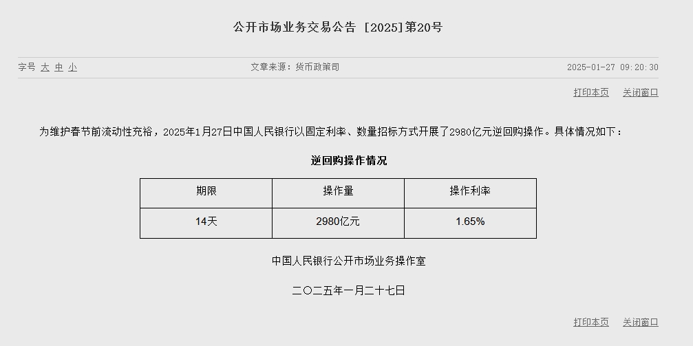 1月27日金融一线消息,为维护春节前流动性充裕,2025年1月27日中国人民银行以固定利率、数量招标方式开展了2980亿元逆回购操作。