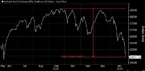 印度股市持续了一个月的抛售势头几乎没有减弱的迹象,周二一项小型股指数大幅下挫,从9月份的峰值跌幅达到20%。在周二早盘下跌逾3%后,印度证券交易所(NSE)Nifty Smallcap 250 小盘股指数势将进入熊市。该指数周一下跌3.7%。近几个月来,由于对经济放缓和盈利增长的担忧导致外国基金退出印度股市,印度股市遭受重创。随着避险情绪加深,中小型股似乎在最近的下跌中首当其冲。自去年9月底以来,海外投资者已从印度市场净撤出逾190亿美元资金,仅1月份就有逾70亿美元资金流出。