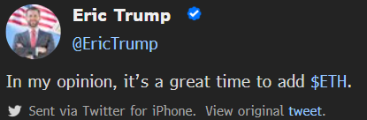 特朗普的第三个孩子埃里克·特朗普周一在社交媒体平台X上发帖称“在我看来,现在是增持$ETH的好时机。你可以以后再谢我。” 他后来编辑了该帖子并删除了第二句话。World Liberty和Trump Organization的代表没有立即回复置评请求。