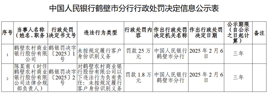 2月8日金融一线消息,中国人民银行鹤壁市分行行政处罚决定信息公示表显示,鹤壁农村商业银行股份有限公司因未按规定履行客户身份识别义务,被罚款25万元。陈某甫(时任鹤壁农村商业银行股份有限公司法律合规部负责人)被罚款1.8万元。