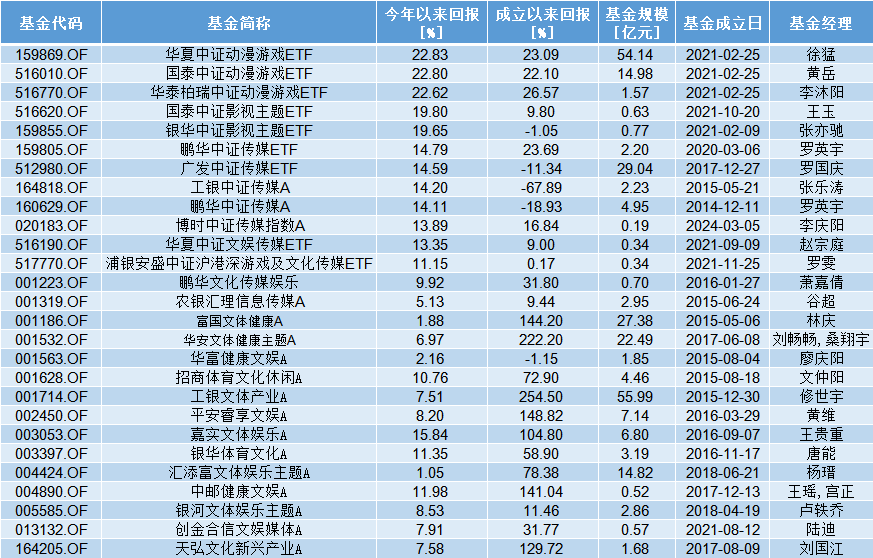 对于投资者而言,若看好文化传媒行业长期发展趋势,相比于买单只股票,或可考虑通过布局相关主题基金参与。华夏中证动漫游戏ETF、国泰中证动漫游戏ETF等表现优异的基金或仍可关注。传媒主题基金中,鹏华中证传媒ETF、广发中证传媒ETF规模较大,分别为30.75亿元、16.35亿元。主题权益基金中,工银文体产业股票(001714)、招商体育文化休闲股票A(001628)或布局。