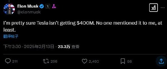 当地时间周四上午,马斯克在X上回应了一位用户发布的有关“装甲特斯拉”合同的帖子,他写道:“我很确定特斯拉不会得到4亿美元。至少没人跟我提过。”