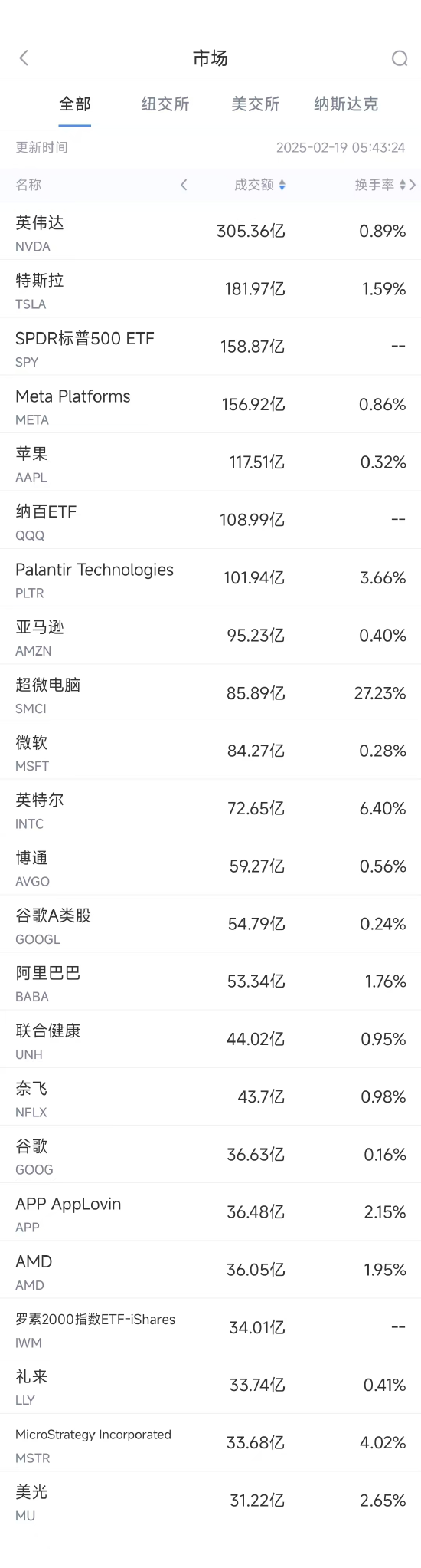 2月18日美股成交额前20:Meta收跌2.76%,结束20连涨
