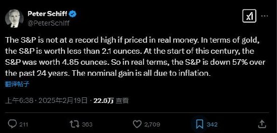 希夫周二在社交平台X上写道:“如果以真实货币计价,标普指数并未处于历史高位。以黄金计算,标普500指数的价值不到2.1盎司。而本世纪初,标普指数为4.85盎司。因此,按实际价值计算,标普500指数在过去24年里下跌了57%。名义上的收益都是由于通胀。”