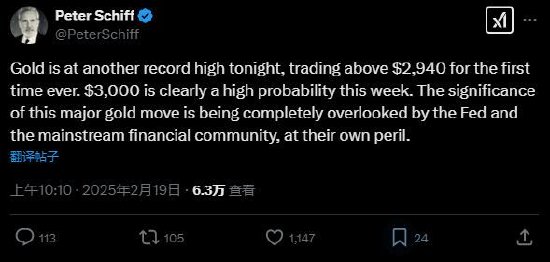 希夫在另一条帖子中强调:“今晚,黄金价格再创新高,有史以来首次突破2940美元。3000美元显然是本周的大概率。美联储和主流金融界完全忽视了这一重大黄金变动的意义,这将给他们自己带来危险。”
