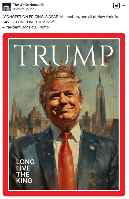特朗普写道:“拥堵收费政策已死。曼哈顿,乃至整个纽约都得救了。国王万岁!”