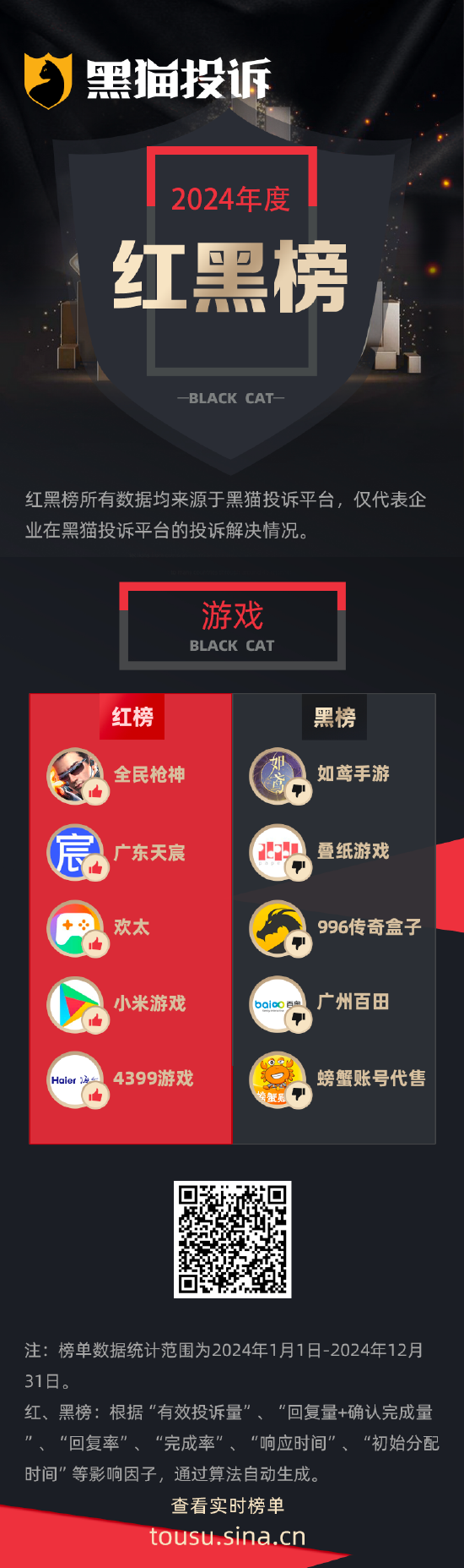 黑猫投诉 【下载黑猫投诉客户端】平台发布2024年度企业红黑榜榜单,涉及游戏、影音直播、网上商城等17大领域,通过“有效投诉量”、“回复量+确认完成量”、“回复率”、“完成率”、“响应时间”、“初始分配时间”等多个维度的影响因子计算权重得出排行,客观反映企业2024年投诉处理情况。