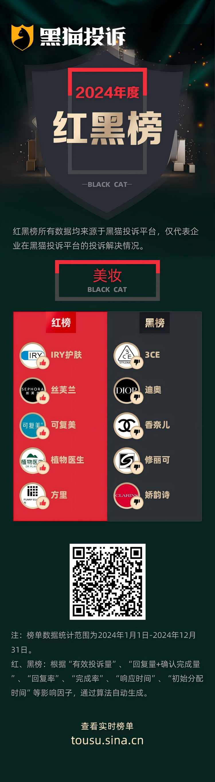 黑猫投诉发布2024年度美妆领域红黑榜榜单:3CE眼影盘破损发霉