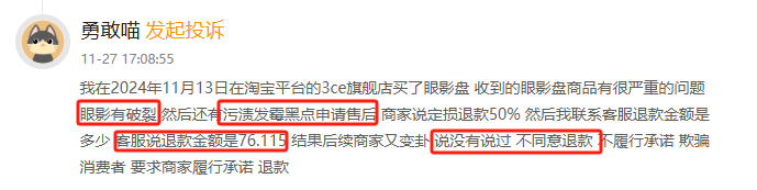 在本年中黑猫投诉平台收到用户反馈称,消费者在3CE旗舰店买了眼影盘,收到的眼影盘商品有很严重的破裂以及污渍发霉黑点。申请售后商家说定损退款50%,退款金额是76.115 ,后续商家又称没有说过,不同意退款。截至2024年底,3CE累计投诉659件,回复率仅为17.60%。