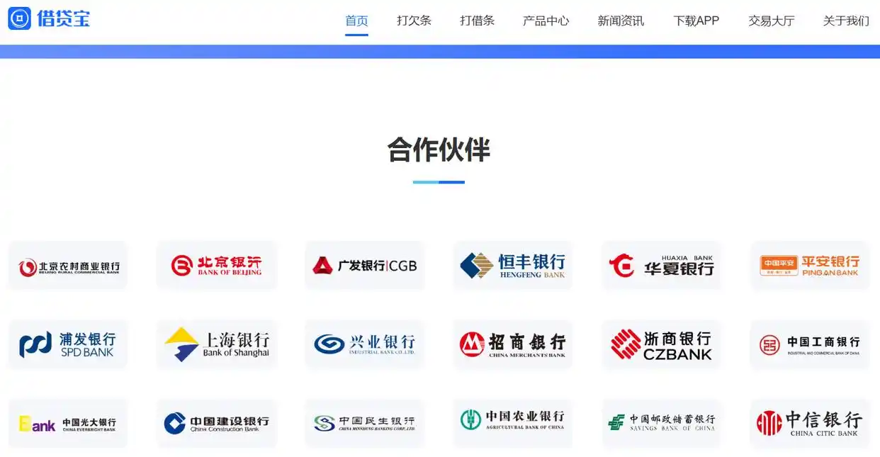 据借贷宝官网介绍,借贷宝是打借条欠条、个人借钱、企业融资的平台,其显示的注册用户达1.4亿,已成功借贷1000万人。据其披露,借贷宝的合作伙伴包括多家国有银行、股份行等银行机构,工商银行、农业银行、建设银行、邮储银行4家国有大行,中信银行、招商银行、浦发银行、光大银行、华夏银行、民生银行、广发银行、兴业银行、平安银行、浙商银行、恒丰银行11家股份行,以及北京银行、上海银行、北京农商银行等城商行与农商行均位列其中。