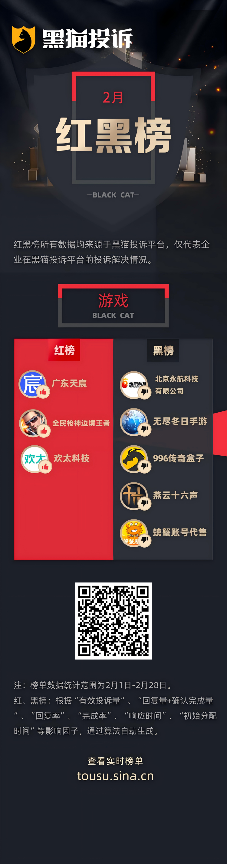 黑猫投诉 【下载黑猫投诉客户端】发布2月企业投诉处理红黑榜单,数据均来源于黑猫投诉平台,反映了企业在黑猫投诉平台的投诉处理解决情况。