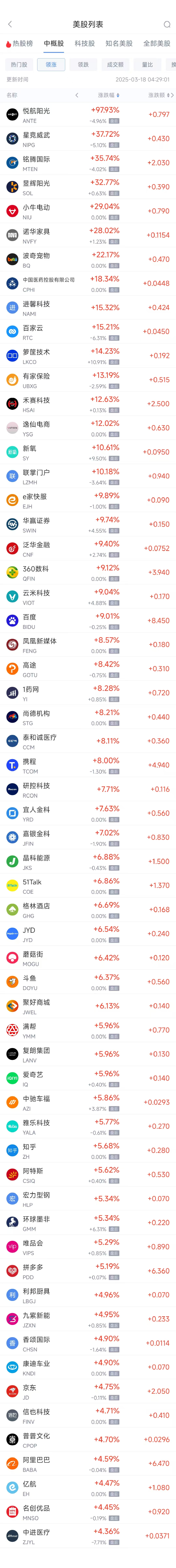 上涨股当中(按市值从高到低),台积电涨1.23%,阿里巴巴涨4.59%,拼多多涨5.19%,京东涨4.75%,携程涨7.48%,百度涨9.01%,中华电信涨0.05%,贝壳涨2.87%,小鹏汽车涨3.50%,腾讯音乐涨4.06%,日月光半导体涨1.14%,中通涨3.81%,满帮涨5.96%,华住酒店集团涨3.11%,蔚来涨2.65%,哔哩哔哩涨3.92%,BOSS直聘涨3.65%,唯品会涨5.29%,新东方涨0.16%,360数科涨9.12%,WSP控股涨2.38%,万国数据涨0.51%,名创优品涨4.45%。