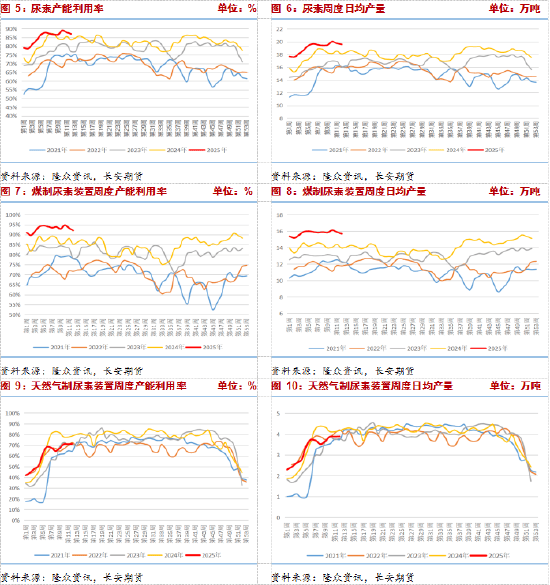 上周国内尿素装置产能利用率87.05%,环比下跌0.86pt,高于去年同期3.37个百分点,尿素日均产量19.58万吨,环比下降0.17万吨,降幅0.48%,同比增加1.46万吨,增幅8.08%。