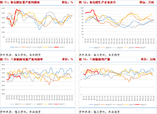 工业需求方面,高氮肥价格坚挺,厂家去库顺畅,挺价意愿明显,复合肥厂开工率环比回落,上游原料价格上涨,导致部分厂家生产积极性下降,但季节性数据看仍处在同期高位,故对尿素仍有需求。与尿素等单质肥相同,复合肥需求也受农需影响,目前农需阶段性走弱,经销商拿货节奏有所放缓,部分厂家预收夏季肥订单。3月21日当周,复合肥装置产能利用率53.03%,环比降2.9pt,高于上年同期0.02个百分点,复合肥样本企业库存55.89万吨,环比增0.16万吨,同比降13.61万吨。