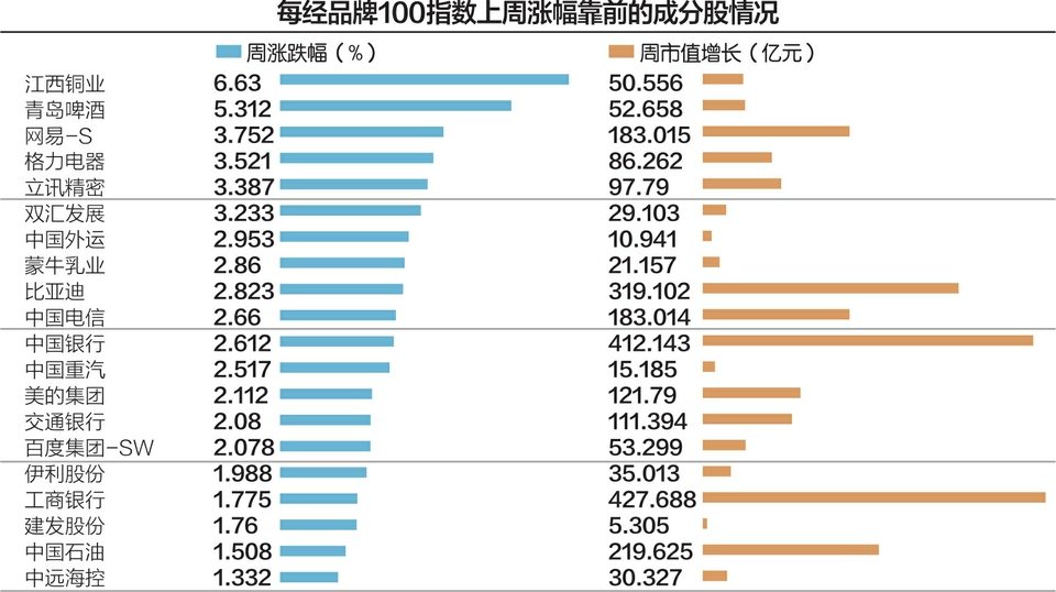 从成分股表现来看,上周每经品牌100指数有44只个股实现上涨,占比近45%,其中,江西铜业和青岛啤酒周涨幅均超过5%,分别达到6.63%和5.31%。另外,网易、格力电器、立讯精密以及双汇发展周涨幅也都在3%以上。