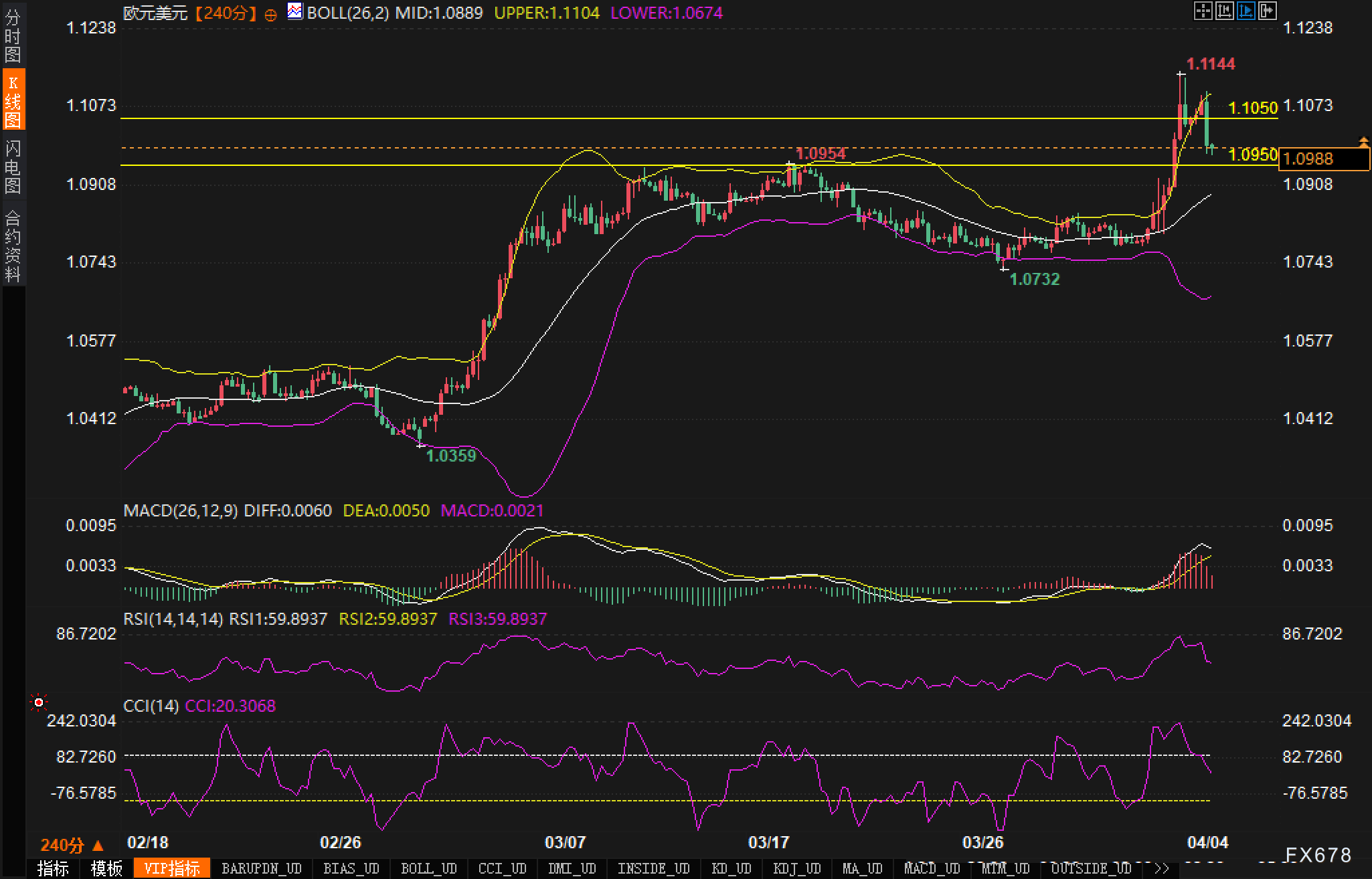汇通财经APP讯――周五(4月4日)欧盘时段,欧元/美元回落至1.10关口附近;在前一交易日刷新高点后,当前各项超买指标迎来修正行情。