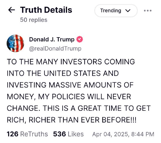 美国总统特朗普在社交媒体发帖称,对于许多进入美国并投入大量资金的投资者,其政策永远不会改变。这是一个致富的好时机,将比以往任何时候都要富有。