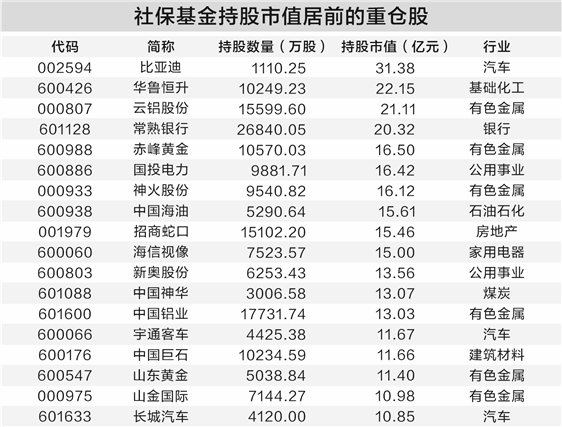 从社保基金最新持股看,据证券时报・数据宝统计,截至最新披露的数据,去年四季度末社保基金共现身184股前十大流通股东名单中。按期末价格计算,合计持股市值达到716.22亿元,138股持股市值超1亿元,其中18股持股市值超10亿元,比亚迪(002594)、华鲁恒升(600426)、云铝股份(000807)持股市值居前,分别为31.38亿元、22.15亿元、21.11亿元。