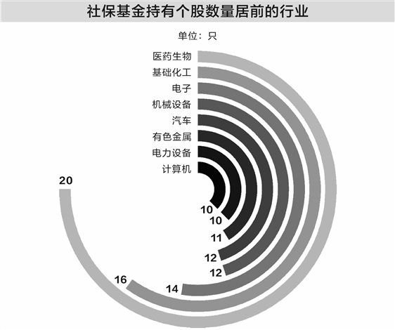 分行业来看,社保基金重仓的医药生物行业个股数量暂时领先,共20股;基础化工行业紧随其后,共16股;其他还有电子、机械设备、汽车行业,各有14股、12股、12股获社保基金重仓。社保基金对有色金属持股市值暂列最高,11股合计持股市值达到111.7亿元。