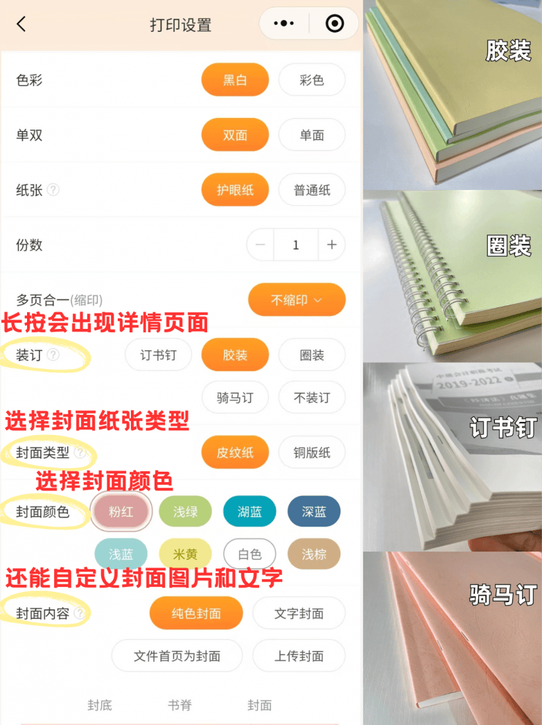 同时,小猴云印提供24小时打印服务,打破了传统打印店的营业时间限制。无论用户是在深夜赶制论文,还是在凌晨急需打印重要文件,都能在小猴云印小程序上随时下单,不受地域和时间的限制。此外,小猴云印还提供多种装订方式,如订书钉、骑马钉、胶装、圈装等,用户可以根据自己的需求选择合适的装订方式,装订后的成品牢固美观,方便翻阅和保存。